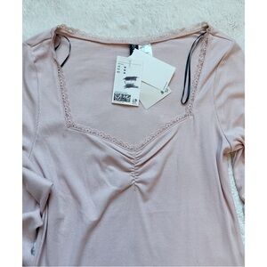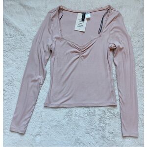NWT | DIVIDED BY H&M | Lace Trimmed Ribbed Long Sleeve Top | Light Dusty Pink | Size: M | Short, Ribbed Top with Viscose Jersey | Sweetheart Neckline | Ruched Effect | 94% Viscose (LivaEco) 6% Elastane | Livaeco™️ viscose is a branded fiber made from wood pulp | Brand New with Tags | Scribbles on tags were like that when I purchased | Always Accepting Offers & Quick Shipping 🌸