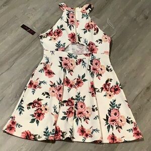 White floral skater style dress. Halter top in the front. Lace detail at the waist. Flared skirt. Zipper in the back at the top & a keyhole cutout at the lower back. Beautiful pink & green floral pattern all over. Juniors size large 11-13. New with tags!