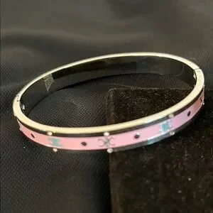 Elegant silver bangle bracelet with a stylish pink design. Perfect for adding a touch of color to any outfit.