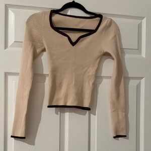 SHEIN Cream Ribbed Long Sleeve Top with Black Trim