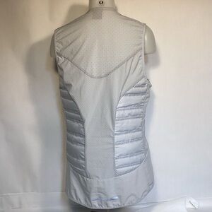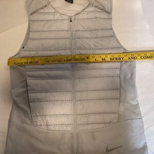 Nike Aeroloft Nike Running Vest, lightweight perfect for early morning or late day runs, perfect athletic wear running or anytime wear. Color is very light gray or silver almost an off white a color that goes with most other colors. Women’s size medium please see measurements