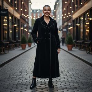 Discover timeless elegance with this black trench coat, perfect for any occasion.