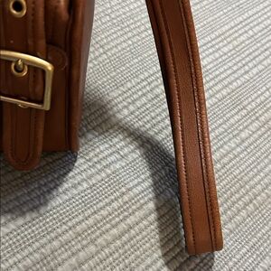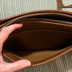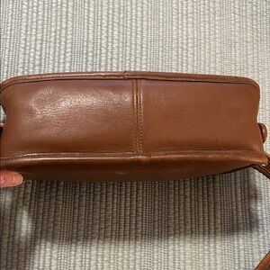 This vintage coach bag is made of glove tan leather a "British tan" color, style number 9164. Bag has three compartments, two outer pockets and central zipper compartment with a wall zip slot inside. Features and adjustable shoulder strap. Google mentioned it was manufactured in 2000. Vintage item, missing original Coach tag. Please refer to pictures as there are visible stains on each side of the bag and the bottom. The inside of the bag is in nice condition, especially the zippered portion of the bag. Length is 10.5.", height 6", and width 3.5". Please reach out to me if you have any other questions.