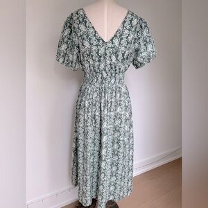 Pretty green and white midi dress with a floral design. Features a flattering V-neck and elastic puffy short sleeves.