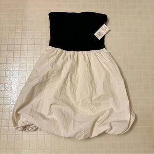 Elegant strapless dress featuring a chic black bodice and a flowing cream skirt. Perfect for any occasion.