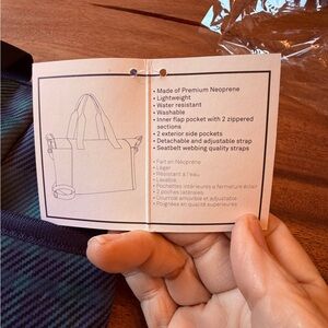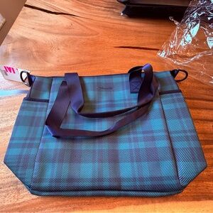 Stylish plaid tote bag featuring a blend of blue and green colors. Perfect for everyday use with a spacious interior and durable straps.