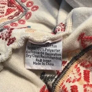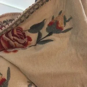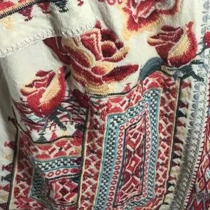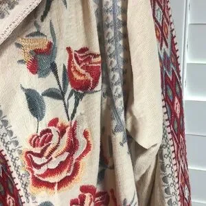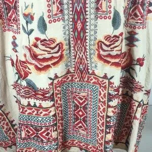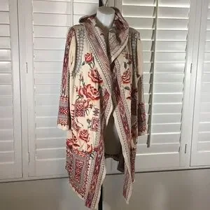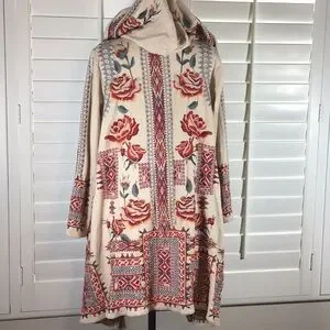 Beautiful knit hoodie coat is soft beige with floral and geometric designs throughout. Long generous sleeves. Embroidered hood flows to open front style, with two front hip pockets. Red is dominant color, with gold, blue, and gray. A statement piece! Measures approx 40” shoulder to hem, across back at chest is 24.5”. Excellent condition. Size XL