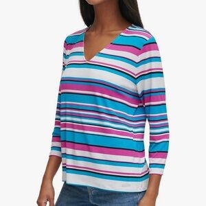 Calvin Klein Striped V-Neck Long Sleeve Top XL Blue, Pink, White
