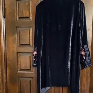 Elegant blue top with colorful embroidery. Features intricate floral designs. Small. I think I’ve worn this top a lot. That’s why there’s a little damage to it but it’s still wearable under arm. It measures 36 inches for the bus in the tunic is longer at the ends but in the front is 30 inches so you could wear these over leggings it has a beautiful print in the front. It just looks like it’s been worn so I hate to throw it away so it does have slit long sleeves, but they embroidery is in good condition.