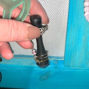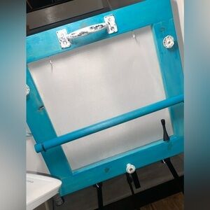 Recently handmade by my dad. He’s retired and he has excellent carpentry skills. The aluminum screen is sandwiched between two handmade wooden frames which holds the screen in securely. There are 4 pieces of quality hardware 1 handle and 3 knobs made out of metal. The black ring holder which is attached on the right bottom side of the frame can hold a large amount of rings. There is a long wooden cylinder that is held by 2 metal hooks and can simply be lifted up to add or remove items. Use the screen to store your earrings. This is a gorgeous functional frame to hang in your bedroom and get you organized. Hardware on back for hanging on the wall.