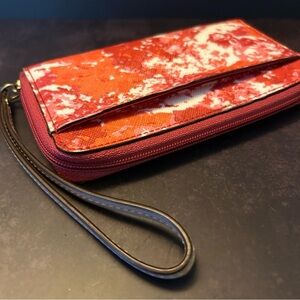 Stylish and vibrant, this Coach wristlet features a striking red and white design. Perfect for adding a pop of color to any outfit.