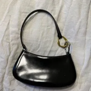 Chic black shoulder bag with gold accent. Sleek design. Perfect for any outfit.