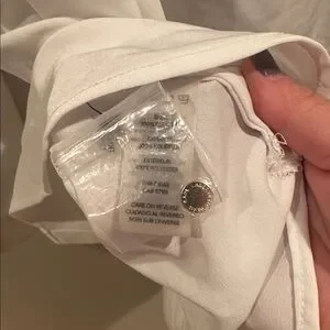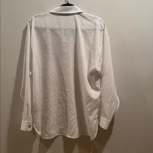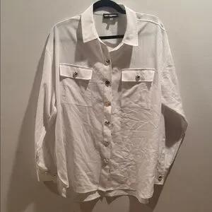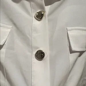 Chic white button-down shirt with gold unique buttons of hearts, Eiffel Tower, star, etc..Features front pockets. Perfect for a polished look. Good condition,23” ptp