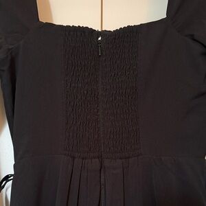 Square neck, front wrap, ruched detail on back, zip up back. Chic black dress with long sleeves. Features a square neckline and tie waist. Perfect for versatile styling.