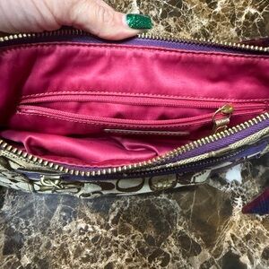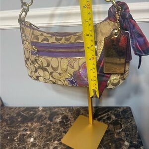 Make a bold statement with this Coach Poppy Tartan Appliqué Groovy Shoulder Bag in classic brown signature canvas with vibrant purple accents. This iconic Poppy-era bag features eye-catching appliqué details, stud and rhinestone embellishments, and signature Coach hangtags with a plaid scarf accent for that true Y2K vibe.