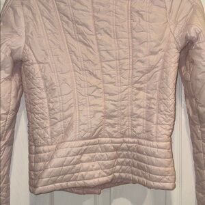 Elegant light pink bomber jacket with quilted design. Features zippered pockets and stylish fit. Perfect for layering.