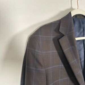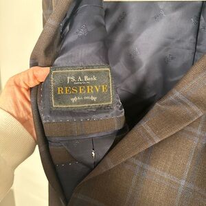 Elevate your wardrobe with this Jos. A. Bank Reserve Collection sport coat, crafted from 100% premium wool for a refined, tailored look. This blazer features a rich brown base with subtle blue plaid, making it versatile for business, weddings, or elevated casual wear.