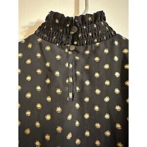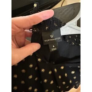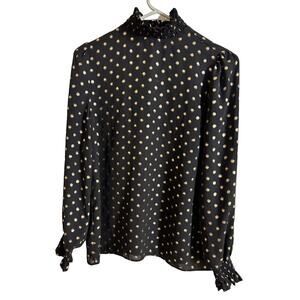Worthington women’s blouse, high neckline that buttons in the back and fitted long sleeves. Black with gold metallic dots. Great shirt for work! Size small.