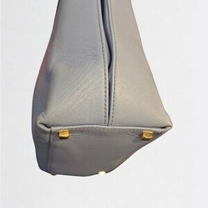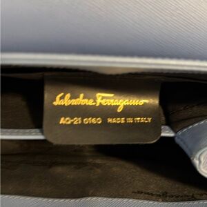 This stylish powder blue Ferragamo handbag features luxurious gold accents, perfect for any occasion. Its sleek design and high-quality materials make it a must-have accessory. 100% authentic. There is some