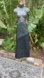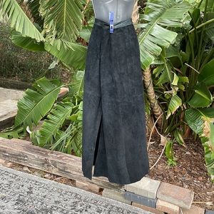 It’s brushed suede skirt begins with a fitted waist, line and a back zipper. The majority of the skirt is black. However, there is an inset deep pewter gray piece in the front with an asymmetric line to it. Skirt is an excellent condition. There are a few barely there marks please look closely. I don’t feel it affects the look, but you may. fully lined.