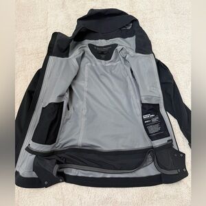 This is a solid thick multi functional shell with plenty of functional pockets, there is a sleeve pocket too I didn’t demo in the video. The hood is large and fits over helmets and has a synch. This is an awesome jacket that doesn’t fit me anymore. There is minor wear and tear, one specifically on the sleeve with gear aid. See the pictures.