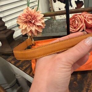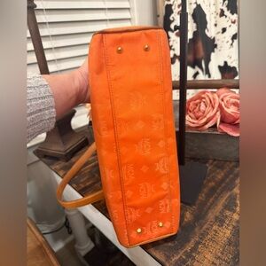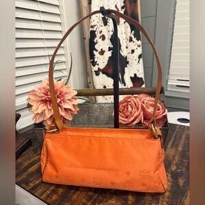 Vintage Bold & vibrant orange MCM shoulder bag with signature logo pattern. Gold-tone accents. Subtle statement piece, perfect for spring! It is a canvas with leather strap and trim. There are some signs of use on the canvas (very light marks-see photo), and one spot on the interior very far side (photo’d). No cracks on the leather. Zipper works great. Interior has a small zip pocket, as well. Please let me know if you have any questions!