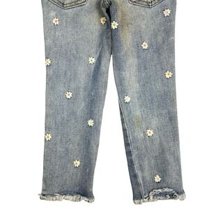 Blue super-stretch skinny jeans featuring allover embroidered daisy flowers and a soft flexible denim feel. Designed for comfort and movement with a playful, decorative finish.