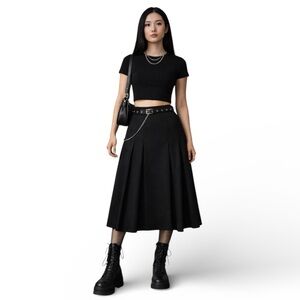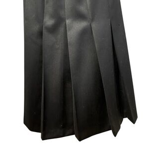 Timeless 1980’s black A-line pleated skirt by Bernard Holzman for Harvey’ Bernard. Two looks in one skirt…versatile styling for the office or statement streetwear. 100% wool outer with 100% rayon lining. This luxe skirt is flat through the front panel, with the pleats starting at the sides, and it’s midi length (hitting mid-calf). That gives it a cleaner, more tailored, professional silhouette instead of a fully pleated, flared look. Side zip/button. Matte sheen. Quality constructed in Hong Kong.