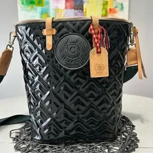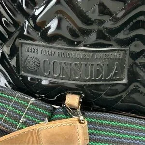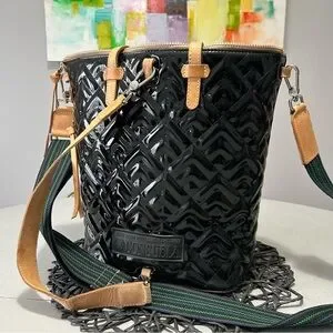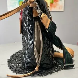 -Includes two detachable straps: a leather shoulder strap that has been primarily used and has signs of wear and an adjustable woven crossbody strap