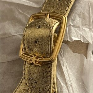 Elegant gold and black women's shoes with a stylish buckle design. Perfect for any occasion.leather fabric upper