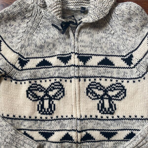 Cozy and iconic TNA Cowichan-style hooded sweater featuring a beige and black knit pattern with zip front closure. Made from thick, warm lambswool with a classic geometric and bow motif, this sweater is perfect for layering on chilly days or adding a touch of heritage style to your casual looks. Brand: TNA (Aritzia) Size: Estimated Women’s XS (please see measurements) Colour: Beige with black pattern Style: Cowichan-inspired zip sweater with hood Features: Zip front, front pockets, ribbed hem and cuffs, heavy knit Material: 100% lambswool Excellent pre-owned condition clean, no pilling or holes. TNA label is missing. Measurements (approx): Bust: 16” pit to pit Length: 22” shoulder to hem Sleeve: 27.5” tna cowichan sweater, aritzia knit jacket, wool zip hoodie, heritage knit, nordic sweater, cozy winter cardigan, chunky knit sweater, apres ski style