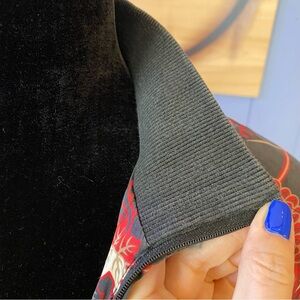 This vintage 90s Notations silk jacket is a striking piece featuring a bold floral print in shades of red and ivory, against a deep charcoal background. The intricate chrysanthemum and vine pattern lends an elegant yet edgy aesthetic, while the lightweight silk fabric provides a luxurious feel. Designed with a zip-up front, a stand-up collar, and ribbed cuffs and hem, this jacket embodies the relaxed yet sophisticated style of the era. Perfect for layering, it’s a statement piece that blends vintage charm with timeless appeal.