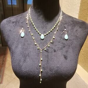 Gold Tone Green Stone Layered Necklace & Earring Set Boho Modern Jewelry