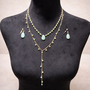 This jewelry set features a double-layer gold tone chain accented with soft green stones and a Y-style drop for movement and visual interest. The matching drop earrings coordinate seamlessly with the necklace for a polished, cohesive look. Nickel free construction makes this set comfortable for sensitive ears while maintaining a lightweight, modern feel.