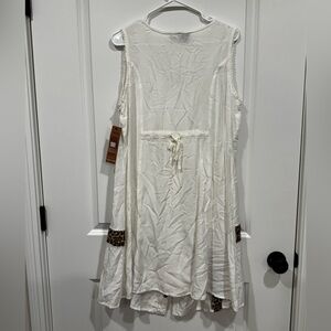New with tags Raya Sun ivory boho dress featuring beautiful embroidery trim and a playful printed leopard ruffle hem. Designed with a ribbed button-front bodice and a flowing, relaxed silhouette that flatters all body types. The elastic band in the back provides a comfortable, flexible fit at the waist while maintaining an easy, breezy look.