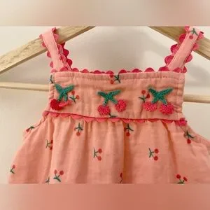 Sweet and playful btween 2T cherry-embroidered tank top in a soft peachy-pink cotton. This little top is covered in tiny stitched cherries, with three larger embroidered cherries across the chest and adorable scalloped straps + trim. Lightweight, breathable, and perfect for warm weather, photos, or everyday wear.