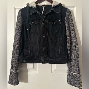 FREE PEOPLE Small Distressed Boho Knit Hooded Moto Jean Jacket Gray Black