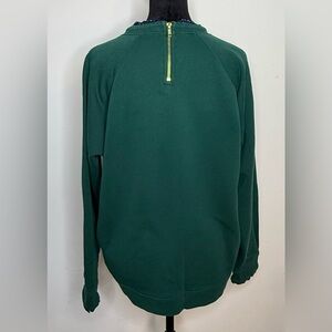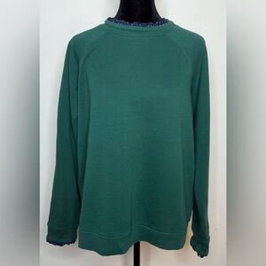 Women’s J. Crew preppy Green crewneck sweatshirt with navy blue, white polka dot ruffle trim at neckline and wrists