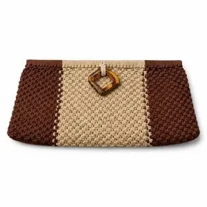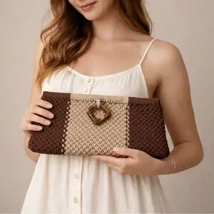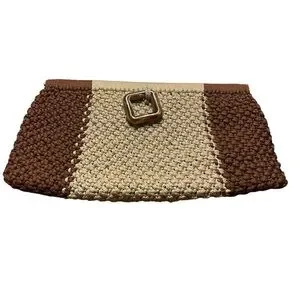 Beautiful vintage hand-crocheted clutch purse featuring a brown and tan color-block design and a distinctive tortoiseshell-style square buckle closure. This bag showcases lovely texture and craftsmanship, giving it a timeless boho, retro, cottagecore feel.