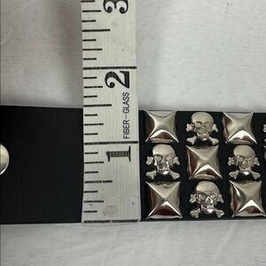 Amp up your studded belt collection with this style featuring metal skulls and crossbones interspersed with the pyramid studs.