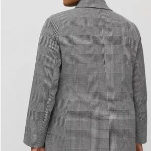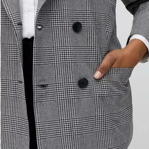 Stylish checkered blazer with a double-breasted design. Ideal for work or casual outings. Textured Glen Plaid Heather Grey. FIT Relaxed fit. Double-breasted. MATERIALS + CARE Studio Crepe woven fabric: Lightweight and a little stretchy, this fabric does dressy and casual equally well. Stretch level: Low. 92% polyester, 8% spandex. Machine wash cold. Tumble dry low. Imported. DETAILS Notch collar neckline. Long sleeves. Four button closure. Hip welt pockets. Back vent at bottom hem. Fully lined.