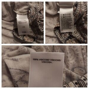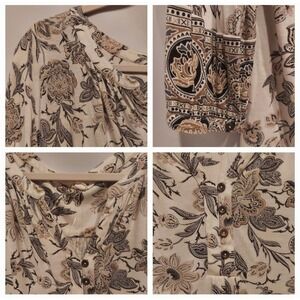 In excellent preowned condition, though, im not sure that it was ever worn. Extremely soft. 100% viscose. Colors are multicolors of cream, biege, black, and green. Put a screenshot in the pics with all the details on this blouse. Very nice blouse.