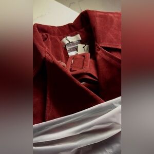 Stylish double breasted long burgundy wine colored trench coat with a belt. Perfect for a chic look from casual to dressy!