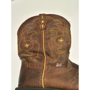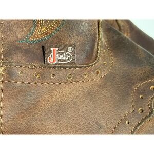 Step into classic Western style with these rugged Justin Gypsy cowboy boots. Crafted from rich brown leather, these boots feature intricate stitching with yellow and teal accents, showcasing star and swirl motifs that evoke the spirit of the American West. The durable square toe and sturdy heel provide comfort and support for all-day wear, while the signature Justin Gypsy sole ensures reliable traction. These boots are perfect for hitting the rodeo, exploring the countryside, or adding a touch of Western flair to your everyday look.