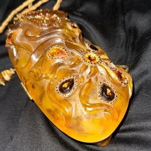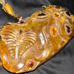 Intricate amber gold carvings with inlaid crystals. Unique design.