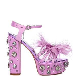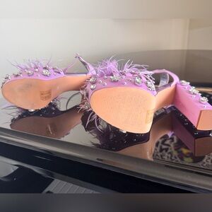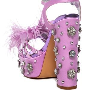 Lavender heels with feathers and sparkling studs. Eye-catching and glamorous.