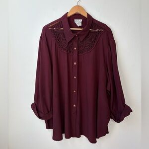 Chic blouse with intricate lace detail. Gorgeous colour and sweet buttons. So feminine and perfect. Acetate/rayon blend. In excellent vintage condition.