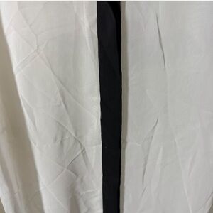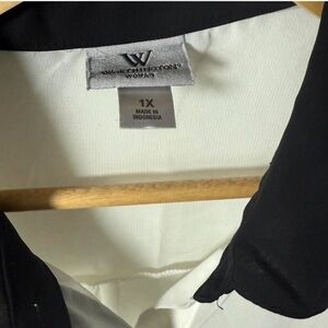 Chic and versatile Worthington Woman blouse in size 1X. Features a sheer white body with bold black accents along the collar, cuffs, and button placket. Long sleeves and lightweight material make it perfect for layering at work or dressing up for dinner.