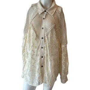 This oversized shirt combine classic and delicate elements, creating a uniquely charming piece! Combined lightweight mesh with natural & colored chambray and floral eyelet lace plus pearl embellishments makes it easy to dress up or down!