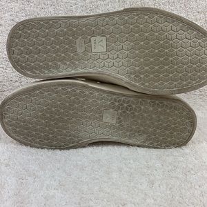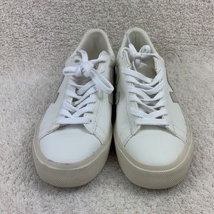 Stylish Veja sneakers. White leather with tan/gray accents. Comfortable and versatile. These have been worn a handful of times They have a couple of scuffs that can easily come off with a magic eraser, lI just didn’t have one. No major signs of wear.